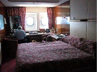 Our cabin seems quite spacious, and as I said earlier, there is a place for everything. We have a queen bed, a large makeup mirror and bench and a wall-to-wall bank of drawers in front of our windows, two sitting chairs and a table between, a chest of drawers on each side of the bed, television, a small fridge, a small closet and a much larger walk-in closet with some shelves and a shoe rack, a safe, and a full-sized bathroom with a shower and a tub. We get fresh fruit in our room each day, which is a nice touch. We have put out some family photos and have some small speakers that we attach to the laptop or the iPod to play our own music (thanks for the great idea, Barbara), so the room feels quite cozy. We can have any of our meals served in the room, but haven't done so yet.