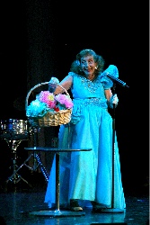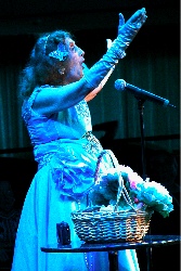 The QE2 Diva: I mentioned this lady in an earlier entry, and last night we had a chance to hear her sing and to have a drink with her. It was a formal night, and as Mike and I walked toward our favorite bar for an after dinner drink, the Diva passed us coming in the opposite direction. My eyes widened as she floated by, and from behind me, I heard Mike say "Holy Shit!" She was all decked out in the most incredible costume - it was a low-cut concoction of pink with layers of white lace, a white veil, on her head, and pink satin full-length gloves that didn't have any hands but ended in pink satin bows at her wrists. Mike said it looked as though she was wearing a bunch of table cloths. As we were later sitting in the Chart Club, having our drink with Daniel and Michael (the gay couple from New York who asked to be referred to as the Publishing Mogul and the Retired Litigator in my characters list), Mary (the Diva) came in with a camera man in tow, and decided she would sing us all an aria and asked the piano man to accompany her. She performed "Mio Babbino Caro" complete with dropping to one knee at the emotion-packed ending. You had to be there to fully appreciate what I am telling you. (The photos shown below were taken at a later talent show, so you can see the Diva in her Mimi from La Boheme frock.)