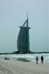 Once we got the gold purchase out of the way, we set about seeing old and new Dubai. And what a contrast! Old Dubai is fascinating, with it souks selling spices, cloth, gold, perfumes, kitchen wares, and all manner of fruits and vegetables. The souks, interspersed with mosques and houses with wind towers, are located on both sides of the creek. We crossed the creek on an abra, or water taxi. Their captains call out until the boat is full and then they depart. It was a fun way to get around and let us see the city from the water. It was fascinating to see the traditional teak-built trading dhows, exactly the same as those used since the days of Romans except they use motors instead of sails, double- and triple-parked in front of modern skyscrapers. Probably the most famous piece structure in Dubai is the 1054 ft. Burj Al Arab Hotel, which looks like a great white sail rising out of the Gulf (see above). Built on its own small island, this all-suite hotel charges a minimum of approx. $1000 per night for the least expensive suite.