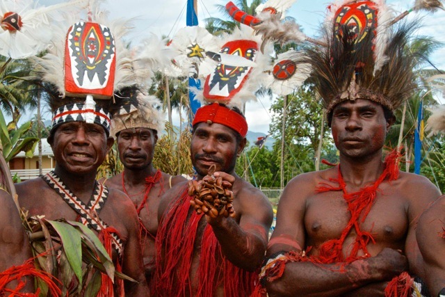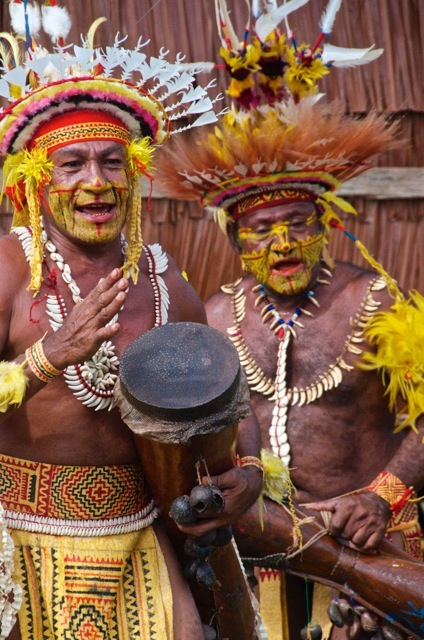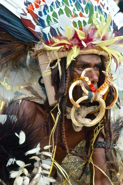 For me, the trip really began when we docked at Alotau, the capital of Milne Bay Province in Papua New Guinea. Within this province, there are more than 600 islands, 160 of them inhabited, and about 276,000 inhabitants speaking about 48 languages! Alotau is a sleepy little town built on the hillsides of the northern shore of the bay, but we were lucky enough to hit it on the weekend of the annual Canoe Festival, so the place was jumping. It was like going to a county fair in the US, complete with rock bands and cotton candy! There was a difference though in that it was also a time to respect their cultural traditions, with tribes and clans coming from all over the island plus some of the neighboring islands to perform their dances in their unique costumes, race their incredibly long dugout canoes, and to party and socialize. The costumes were incredible as you can see from the pictures below: