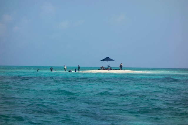 This photo shows what is left at high tide of the beautiful sand beach that we snorkeled off in the morning. And it was smaller than this by the time the last person got into the zodiac. I took this from the glass-bottom zodiac as we skimmed over the water.