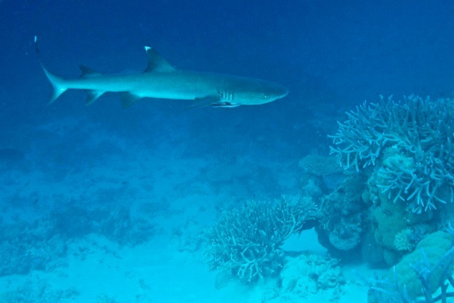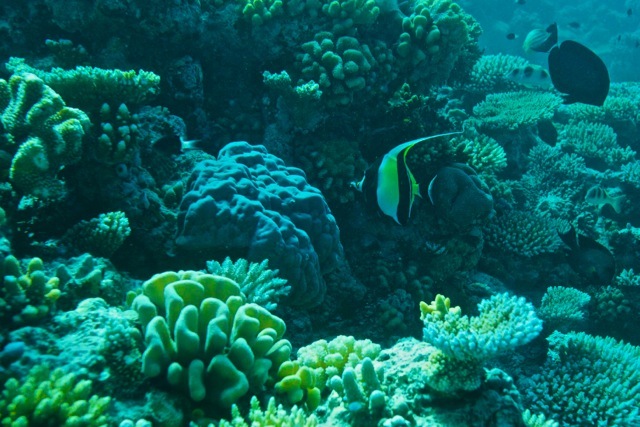 Yippee skippee! Today we reached the Great Barrier Reef, the world’s largest reef system, and the day was filled with opportunities to go snorkeling, diving or out in the glass-bottom zodiac. Mike and I went snorkeling in the morning and it was quite incredible! The multi-colored corals were a marvelous sight, as were the equally colorful fish that inhabit them. I am including a couple of photos taken by Mark Thiessen, the NG photographer. The first shows a beautiful Moorish Idol fish and the second is of a White-tipped Reef Shark. You can’t get a feel for the true colors of the coral, but you can see a sampling of the variety.
