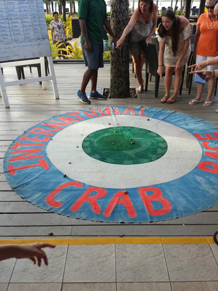 And here you see one of the most bizarre events I have witnessed - the International Crab Race! A fellow came along to the bar with a container of small crabs, set them out on the mat he carried with him, and then took bets on which crab would reach the edge first. Each crab as named after a famous athlete from a different country. What amazed me the most is how many people were willing to place bets and how excited they got to watch their crab amble towards the finish line! I was above all that and did not participate - I mean, seriously, what fool would bet on Wayne Gretzky, Canada’s greatest hockey player, when he is racing in the heat of Fiji!